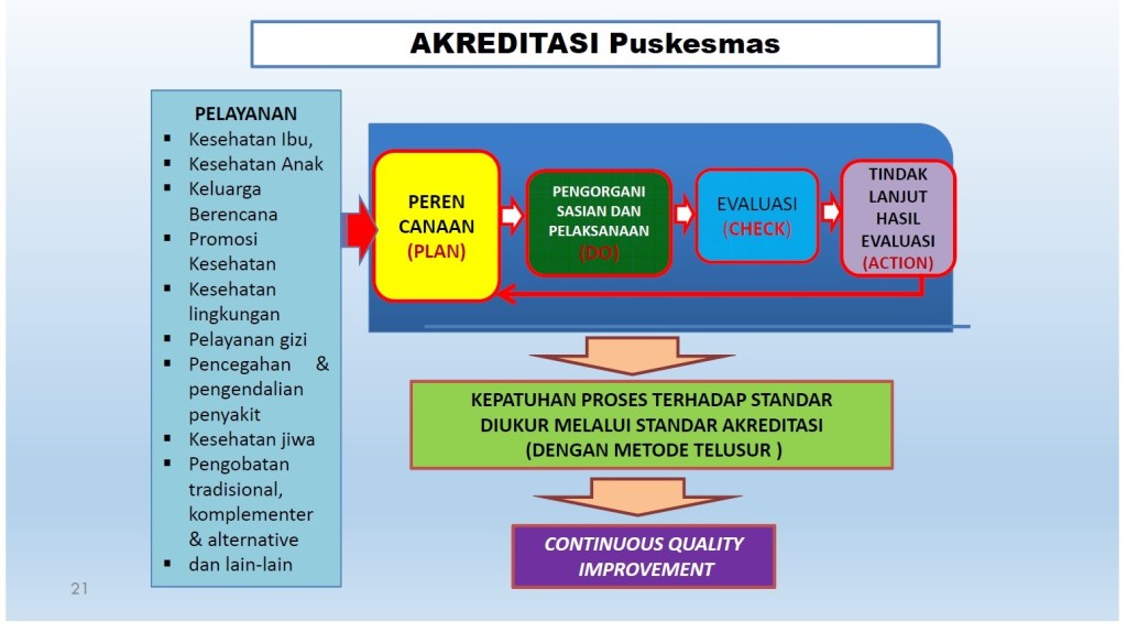 Akreditasi Puskesmas, Puskesmas Pratama, Tempat Praktik Mandiri Dokter, dan Tempat Praktik Mandiri Dokter Gigi adalah pengakuan yang diberikan oleh lembaga independen penyelenggara Akreditasi yang ditetapkan oleh Menteri setelah memenuhi standar Akreditasi.